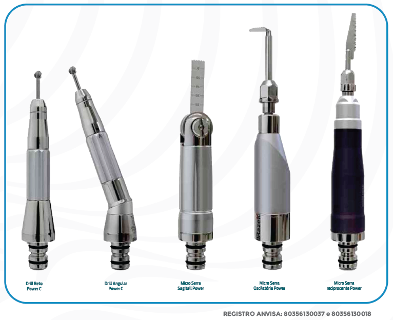 Os Drills Power C e as Micro Serras Power, em conjunto com um Micro Motor, são utilizadas em cururgias de bucomaxilo.